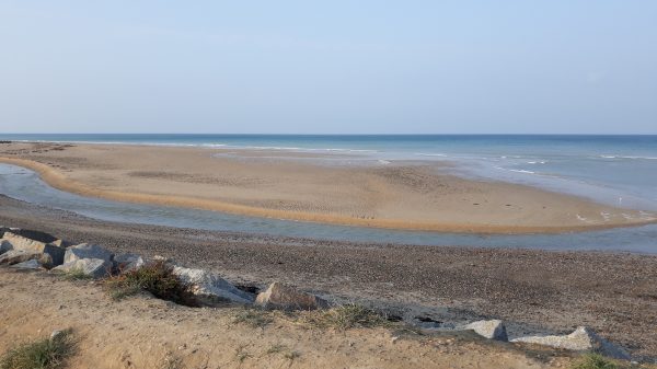 Dominique m’attend sur le parking au-dessus de l‘Estuaire du Thar, petit fleuve de 25 km prenant sa source près de Villedieu les poêles. Forte de mon expérience de la veille avec les traversées du Lerre et de la See-Selune, je passe le Thar à gué sur la plage sous l’oeil de deux dames qui m’applaudissent. Des centaines de mouettes et goélands étaient sur la plage mais à mon arrivée il n’en reste presque plus.