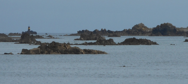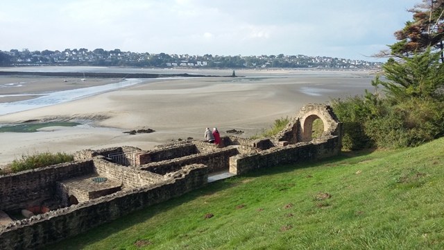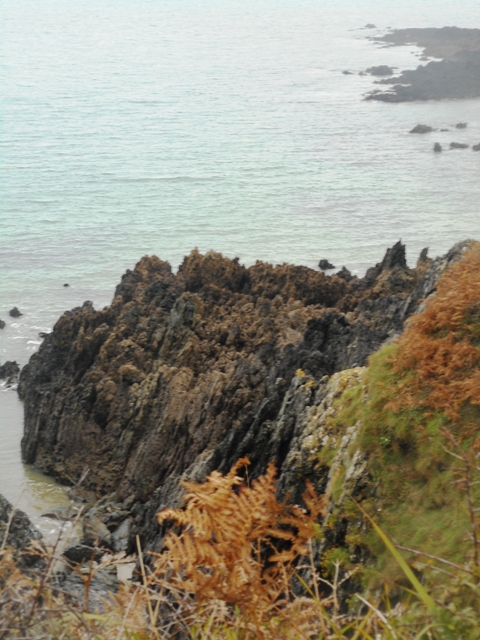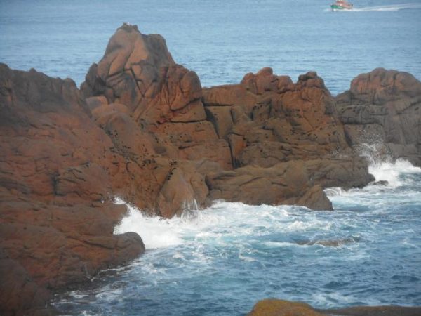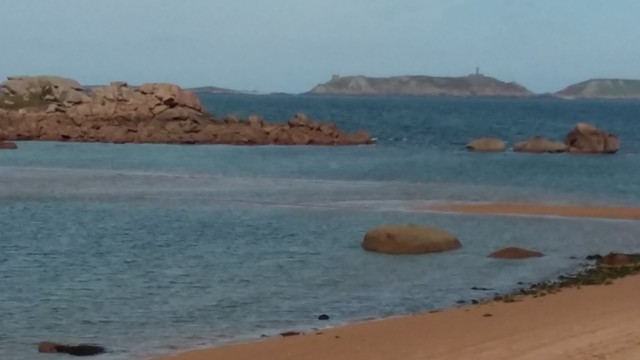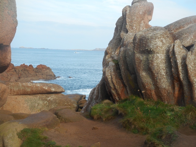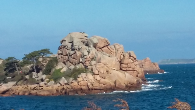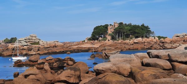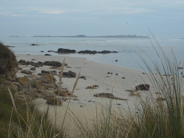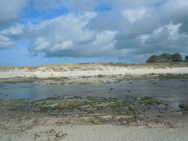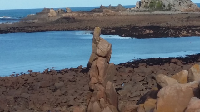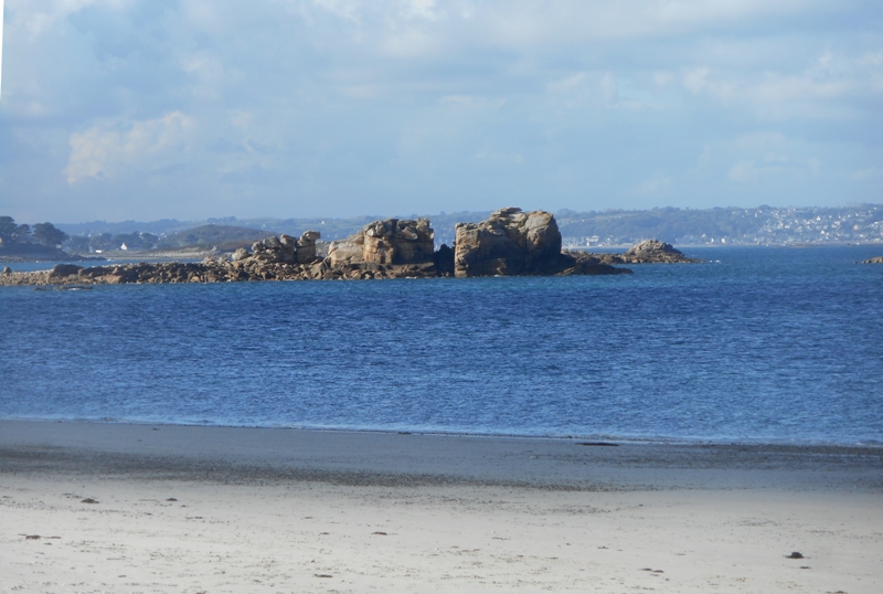 Le chemin du retour se fera pour moi à pied sur le sentier des douaniers jusqu’au Port la Chaine, balade très agréable parce que variée, je monte descend sur la plage de Porz Ran puis dans une minuscule anse. Des panneaux de céramique commentent les curiosités locales qu’on ne remarquerait peut être pas seul : les queues de comètes formée par accumulations de roches ou les pêcheries. Au Port la Chaine on a construit une sorte de phare, comme une maison sur le rivage, c’est une endroit paisible qui est une halte agréable.
