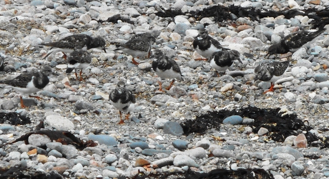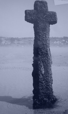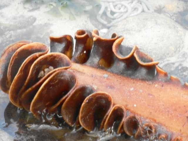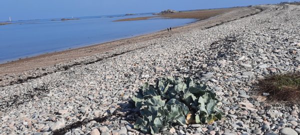 J’enlève mes sandales pour passer le gué pieds nus et les garde à la main pour marcher sur le sable mouillé un peu vaseux rapidement recouvert de graviers coupants. Je chausse les sandales pour monter sur les galets. Des végétaux poussent sur le sillon : des choux maritimes (Crambe maritime)protégés et des longues feuilles vertes vernissées des blettes maritimes.