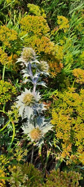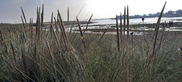Par un matin sans nuage, la lumière est très belle. Je m’engage sur le sentier entre les ganivelles de bois qui retiennent le sable et canalisent les promeneurs, les empêchant de piétiner les oyats et surtout les œufs des nombreux oiseaux qui nidifient. Les plumets des graminées, en contre-jour, donnent du relief au paysage de marais maritime vers l’est. Les chardons maritimes et les cristes marines (Crithmum maritimum) se détachent sur la mer ouverte bleu profond.