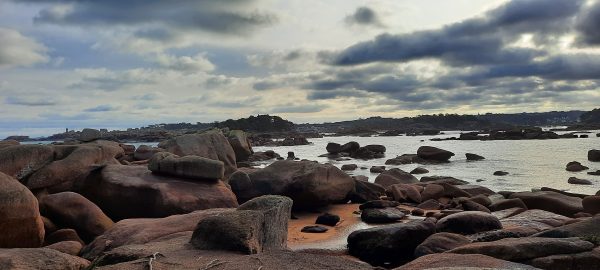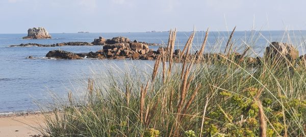 Le Sillon de Talbert est un cordon de dune et de galets de plus de 3 km de long accumulés par les courants contraires du Jaudy et du Trieux. La langue de terre s’enfonce dans la mer en s’incurvant entre les rochers et les écueils de la côte rocheuse à l’ouest et les marais vers l’est. En 2018 une tempête a créé une brèche dans le sillon si bien qu’il faut bien choisir son heure si on veut aller au bout. Les horaires des marées sont placardés avec la stricte recommandation de ne pas s’aventurer à gué, les courants pourraient être violents. C’est la première fois que les conditions sont favorables pour la (petite expédition) : beau temps et horaire de marée confortable.