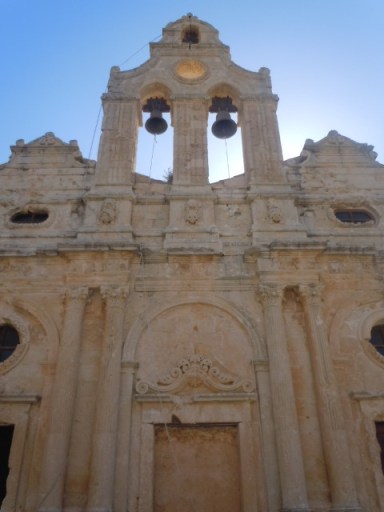 Le fort Koules domine la marina. Le bord de mer doit être animé le soir avec ses restaurants de poissons, ce matin, c’est vide et mort. Plus « grec » que le port vénitien de Rethymnon ou de Hania : tables carrées en bois, pas d’images des plats, des efforts de décoration : on a posé des filets sur chaque table. Plus loin, des ruines (fouilles archéologiques ?) et une église.