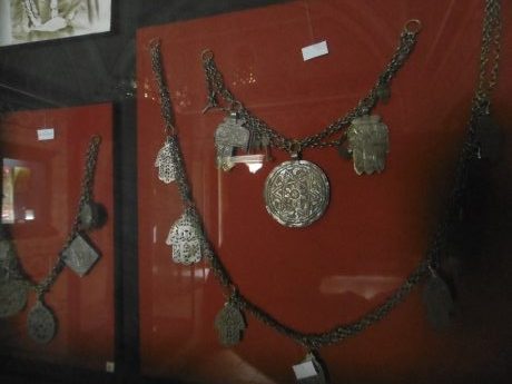 Tout autour, dans les vitrines, les parures féminines sont en or pour le mariage, en argent pour la vie quotidienne. Les orfèvres étaient juifs. Bracelets et anneaux de cheville : les anneaux de chevilles étaient lourd et pesaient jusqu’à 1kg. Certains étaient creux contenant des billes qui tintaient comme des grelots, la femme signalait ainsi sa présence. On voit ensuite les parures de taille, ceintures, lacets colorés, chaines porte-amulettes. La main de Fatma coexiste avec l’étoile de David, symbolisant la coexistence des communautés. Les parures de tête comprennent le voile de tête, mais aussi les tatouages berbères les boucles d’oreille. La jeune fille porte de petits anneaux au lobe de l’oreille percé. La femme mariée a de grands anneaux qui reposent derrière le pavillon de l’oreille. On peut connaître le nombre et le sexe de ses enfants en regardant les pendentifs (main de Fatma pour els filles, rond pour els garçons) La boucle est aussi un porte-amulette : dans le cylindre de droite, les 5 derniers versets du Coran, dans le cylindre de gauche, l’acte de mariage.