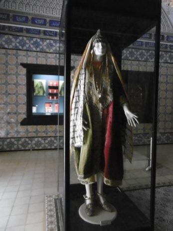L’exposition est consacrée aux parures féminines et au mariage. Les robes de mariées occupent deux vitrines. Celle du premier jour est à moitié verte, à moitié rouge, le vert pour le Paradis, le rouge pour le divorce. Sur une chaînes deux bijoux symboliques la main de Fatma pour la fille, le disque pour le garçon, les deux enfants que la mariée espère ; Dans l’autre vitrine, la robe du 7ème jour. La fête durait autrefois 7 jours et chaque jour la mariée revêtait une robe différente.