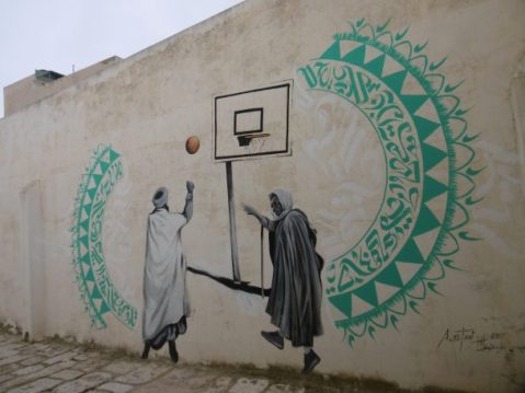 Le gardien de la Casbah téléphone ensuite pour qu’on ouvre la Mosquée Bou Makhlouf . Devant la mosquée on a installé un café avec des tables basses, des cannisses. On pourrait aussi fumer le narghilé. Il est trop tôt. Pas de consommateurs, c’est trop tôt, les employés on mis très fort la radio avec de la musique profane. La « mosquée » est une zaouia, siège d’une confrérie soufie. Ce n’est plus une mosquée, on n’y fait plus la prière – trop exigu – selon son gardien qui me laisse photographier à mon aise les stucs et carreaux du 17ème siècle. Au détour d’un passage, sous une arche, dans la ruelle, un beau graff tout neuf daté 2017, deux hommes en turban et tenue traditionnelle, un grand et un petit jouent au basket, l’un d’eux a des lunettes d’aveugle et une canne. L’auteur possède une maison sous la casbah, émule du facteur Cheval, il a rassemblé des matériaux hétéroclites et a construit un jardin naïf avec des personnages et objets variés.