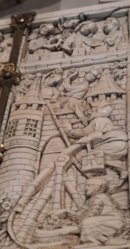 Nous sommes restés longtemps à admirer un coffret en ivoire : l’Assaut du Château d’Amour d’une finesse exceptionnelle et que le sujet profane nous a séduit