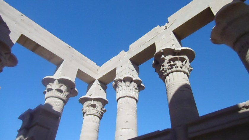 Philae raconte aussi l’Empire Romain avec les portes de Dioclétien, d’Hadrien et le kiosque de Trajan. Récit également de la fin du paganisme et de la christianisation. Les Chrétiens ont martelé les idoles s’attaquant presque uniquement aux grandes figures du pylône et laissant intacts les décors gravés et els hiéroglyphes. Ils se sont cachés pendant les persécutions romaines. Tout semble un peu confus. Des croix coptes assez discrètes sont disséminées ici et là dans la salle hypostyle.