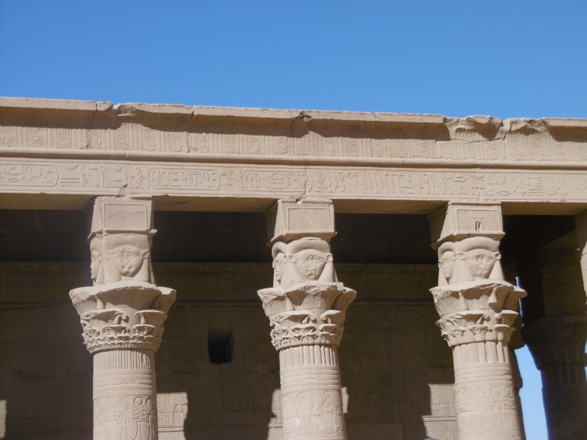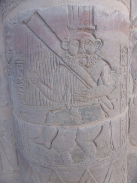 Isis n’était pas la seule déesse vénérée à Philae : Hathor est très présente par els colonnes Hathoriques avec la figure de femme aux oreilles de vache. Dans la cour : 7 colonnes hathoriques font référence aux 7 premiers jours de la vie d’un nouveau-né (les plus difficiles). La tradition des 7 jours perdure chez els Musulmans en Egypte. Déesse de l’enfantement, Hathor est aussi déesse de la musique comme on le voit sur les murs du petit temple d’Hathor où l’on reconnait Bès jouant de la harpe, Sekmeth et un tambour, un singe guitariste, un flûtiste….
