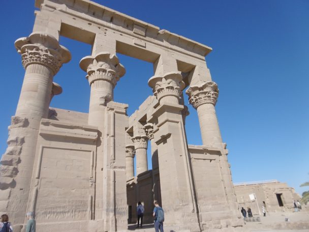 Le Pavillon de Trajan est une très élégante construction avec ses colonnes portant des chapiteaux tous différents. L’un d’eux est décoré de grappes de raisin. Deux palmiers l’accompagnent. La vue est très belle sur le Nil. Traces aussi des visiteurs du 19ème siècle qui laissaient des graffiti sans aucun respect pour le monument. Un nom, une date, une provenance : les murs lisses mais laissés sans décoration étaient des supports rêvés. « Brauerhors, 1851, Berlin »… »Godefrey Levinge 1833 »