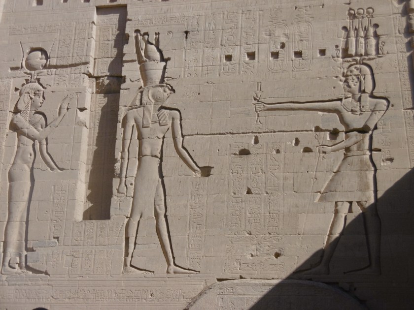 Sur le Pylône, les figures martelées du Pharaon portant les couronnes donne à Hassan l’occasion d’une révision des coiffes, de haute Égypte, Basse Egypte et ptolémaïque qui comporte 3 parties.
