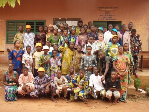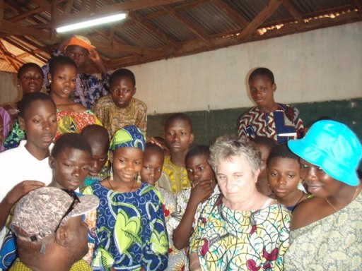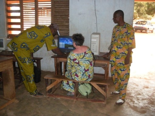 Sur un autre poste, deux garçons rédigent leur lettre que je pourrai emporter sur ma clé. Bosco et Spero, plus âgés ont joué le médecin et un des garçons de la pièce. C’est Spero qui a inventé la pièce. Il a aimé les dessins de Ghada et veut correspondre avec elle. A l’aide de Power point ils joignent des images proposées par Windows. Je suis étonnée de voir qu’ils se débrouillent très bien et connaissent les raccourcis clavier (bien utiles quand la souris est défaillante ce qui doit arriver au Bénin). Depuis Deux mois un cybercafé a ouvert ses portes à Pobè. Ce serait magnifique s’ils écrivaient leurs lettres en classe, venaient les saisir au collège et portaient sur une clé au cyber. Un nouvel élan serait donné à notre correspondance ! Au tableau je calligraphie mon adresse email et celle du blog qu’ils pourront peut être consulter !