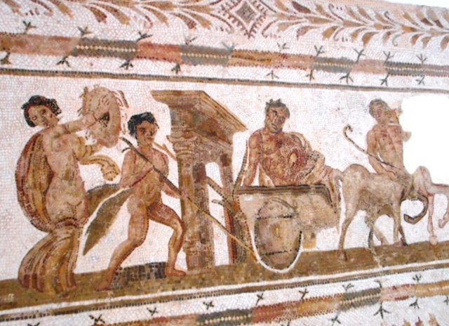 On entre dans les salles présentant la magnifique collection de mosaïques. J’aime que les mosaïques racontent une histoire. Celles de Thysdrus choisissent les épisodes les plus lubriques de la mythologie. Quand elles ne dépeignent pas des scènes érotiques où des corps nus se dévoilent, elles mettent en scène des satyres, bacchantes, processions dionysiaques, le ligotage de Silène ou Bacchus ivre sur un chariot.