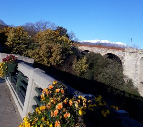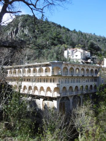 Du Parking des Thermes, je découvre un pont qui enjambe un ruisseau dévalant le ravin où déversent les eaux chaudes des thermes militaires . Une belle promenade plantée de grands platanes surplombe le ruisseau. Les Thermes militaires sont abandonnés, ils ressemblent plutôt à des casernes. Suivant le Mondony, j’arrive avenue du Vallespir, la rue commerçante que je connais bien, et aux bords du Tech que je traverse.