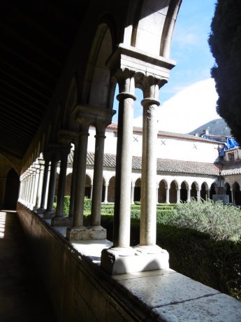 Le cloître est assez grand bordé d’arcades gothiques soutenues par de très fines colonnes jumelles blanches de marbre de Céret et pierre de Gérone. Au centre d’un jardin de buis qui embaume se trouve une intéressante croix de fer avec une boule de fer, la croix du grain, rappelle une activité métallurgique des forgerons catalans.