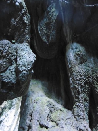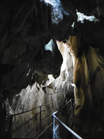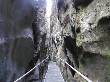 Les Gorges de la Fou se vantent d’être la gorge la plus étroite au monde. C’est peut-être exagéré. Canyon très étroit dans une falaise de 200m de haut, sinueux. C’est un très beau site. Malheureusement, il est très lourdement équipé. On marche sur une grille métallique assurée par des poutrelles. Comme la grille est large elle emplit tout l’espace. Des grilles de chaque côté, et comme si le casque obligatoire ne suffisait pas un filet métallique sécurise contre les chutes de pierres. Le visiteur n’a plus aucune sensation d’aventures, l’eau est cachée, la photographe frustrée…j’imagine comme il doit être plaisant de descendre en canyoning cette gorge !
