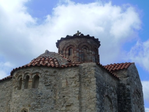 Nous piqueniquons sur la place devant la très jolie église de la Panaghia de Lampini, face au monument aux morts titré EPIGRAMME pour les martyrs de 1827. Décidément la lutte pour l’indépendance contre les Turcs a fait beaucoup de victimes. Lampini est un village tout simple aux ruelles tortueuses et aux maisons chaulées de blanc. Un enterrement va avoir lieu. Les gens qui descendent des voitures sont en grand deuil et portent des bouquets de fleurs. Un homme arrive et sonne la cloche ; la corde pend à l’extérieur, chacun pourrait le faire. Je me faufile dans l’église ouverte pour l’occasion et jette un coup d’œil rapide aux fresques. Nous démarrons avant que le village n’arrive pour la cérémonie funèbre.