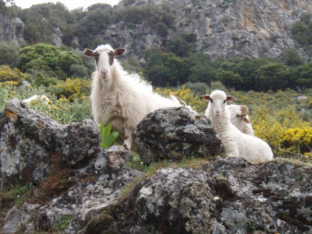 Après 250m, un balisage bleu invite à un itinéraire pédestre vers des gorges. Les 5 premiers mètres sont acrobatiques et ressemblent plus à de l’escalade sur un rocher presque vertical qu’à de la promenade. Comme les points bleus sont bien rapprochés, je me laisse tenter. Suivant ces marques, je m’élève rapidement sur la paroi et chemine sur un sentier de chèvres parmi les sauges de Jérusalem aux beaux pompons jaunes et les épineux ; A condition de bien regarder ou on pose les pieds en évitant les cailloux qui roulent, cela se grimpe bien. Petit pincement à l’estomac toutefois, à l’idée de la descente (qui se révèlera ensuite plus facile que je ne craignais). Quelques rencontres : une belle chèvre noire et ses deux chevreaux jumeaux qui détalent à mon approche ; les moutons sont plus curieux : trois têtes surgissent de derrière un rocher. Le petit bélier aux cornes recourbées me défie. Comme j’avance quand même tout le troupeau dévale la pente. Le sentier se faufile entre deux gros rochers puis descend vers une gorge encaissée.