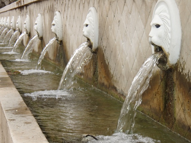 C’est un centre administratif avec une grande mairie moderne, une grande église en ciment, tuiles rouges, et de vastes parkings. L’attraction est la fontaine vénitienne qui crache de l’eau par 24 bouches dont 19 lions de Venise. Hélas elle a été restaurée (trop )!On se passerait des carrelages et des regards métalliques. Les lions repeints en blanc(manie grecque), et les yeux repassés à la peinture noire détonnent.