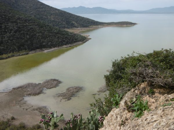 Un escalier monte à l’Ecomusée : une véritable ascension. L’écomusée est installé dans un bâtiment à coupoles. Un inventaire des différentes espèces de la faune et de la flore est présenté par milieu sur des panneaux explicatifs très bien faits. Milieux humides autour du lac , Jebel Ichkeul, oiseaux migrateurs, grotte et chauve-souris. Je note consciencieusement les noms latins, genre et espèce. La plupart me sont familiers : lentisque, oléastre, euphorbe, câprier. En revanche je ne connais ni l’Azerolier (épine d’Espagne) ni Ziziphus lotus(jujubier) ou Phillyrea angustifolia (filaire à feuille étroite). La plupart des canards, sarcelles, foulques hivernant à Ichkeul viennent d’Europe Centrale : Autriche Hongrie Tchéquie, Roumanie. Sans doute les oiseaux d’Europe de l’Ouest empruntent un couloir migratoire passant par l’Espagne et le Maroc. J’aurais aimé plus d’explication sur l’Hydrographie des deux lacs, sur la localisation du chenal qui les fait communiquer ainsi que sur la géologie du Jebel. Sur le Versant regardant Bizerte les oléastres s’accrochent à un substrat rocailleux, le rocher caverneux (dolomie) tandis que près du Centre d’Interprétation, sur le versant qui regarde le Lac d’Ichkeul, le calcaire est marneux lité avec des bancs presque turquoise, il existe aussi des affleurement de marbre ; la végétation est un maquis beaucoup plus touffu , buissons inextricables de lentisques, euphorbes, formant un écrin sauvage au lac d’un vert amande très différent du bleu foncé du lac de Bizerte.