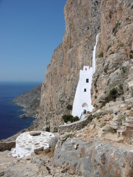 Une seule route traverse Amorgos du nord au sud. On ne risque pas de se tromper. Il faut être attentif aux départs des randonnées pédestres. Les sentiers sont bien balisés et fléchés mais pas forcément repérables de la voiture. Vers le sud, nous dépassons la plage d’Agios Pavlos très jolie baie arrondie fermée par l’île de Chalara. Une passe étroite sépare la petite île de la grande et une langue de galets (tombolo) pointe vers Chalara. L’eau au-dessus des galets est peu profonde et très transparente, d’une couleur merveilleuse. Un complexe hôtelier est construit à l’arrière de la plage, mais assez discret pour qu’on ne l’ait pas remarqué au premier passage. De la route on voit une église comme suspendue à mi-pente ; Un peu plus loin, un panneau signale une « ancienne tour » à mi-hauteur (aucune indication dans nos guides ni sur Internet). L’accès est barré par une grille mais j’apprendrai vite que ces barrières concernent le bétail et que les randonneurs peuvent ouvrir les portes à condition de les refermer derrière eux.