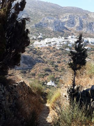 Le sentier N°4 descend à Aegiali tout droit à travers le village puis par un chenin dallé dans une oliveraie. Mais le parcours est fantasque : au lieu de suivre l’allée, les balises montrent un petit sentier dans les broussailles qui remontent dans la colline jusqu’au village haut d’Aegiali. Le port et son village ne se sont développés qu’après 1830 avec la disparition des pirates et l’indépendance de la Grèce. Un âne me barre la route, je le contourne rapidement (il peut toujours ruer).