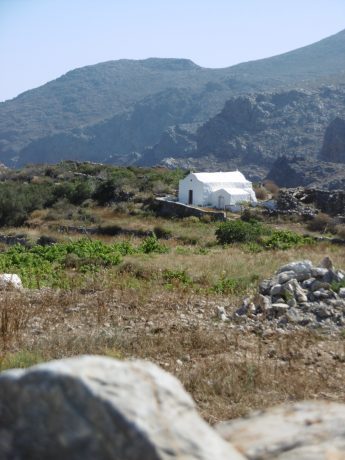 Parmi les vestiges, je trouve l’ancien sanctuaire, mais qu’y célébrait-on ? Seules les enceintes sont reconnaissables ; le sommet de la colline est occupé par la coupole éblouissante d’Aghios Andreas. La porte est ouverte, cela fleure bon la cire. Comme je suis en short, je n’ose pas y entrer.