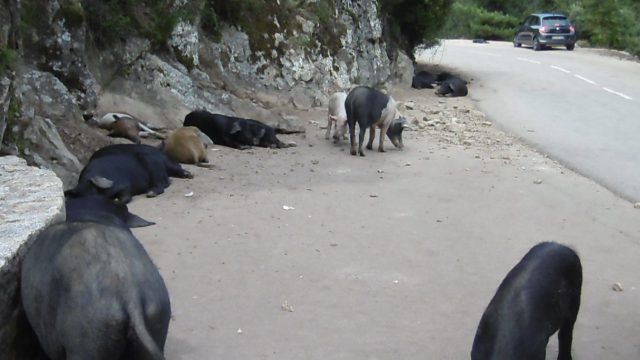 Après les chèvres, les cochons sont vautrés sur le bas-côté, de toute taille et de toutes couleurs. Un verrat noir dort, allongé tandis qu’une truie dispute très violemment un de ses porcelets. Comme les chèvres, les cochons sont une attraction ; les touristes descendent de voiture, filment ou photographient. Les cochons ne sont pas farouches. Un petit vient se frotter à mes jambes. Une jeune femelle se couche sur le dos comme un chien qui demande qu’on lui gratte le ventre. Tous les cochons ne sont pas en liberté ; Certains sont enfermés dans un enclos. Tous finiront en charcuterie, en attendant, ils ont la belle vie. Ces élevages de porcs ne sentent pas mauvais comme les élevages industriels. On ne voit ni lisier ni purin.