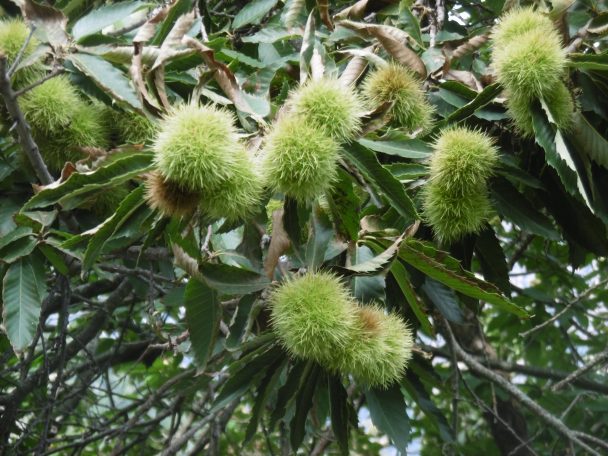 Quand on monte en altitude, les châtaigniers sont plus fréquents. Ils sont déjà chargés de bogues piquantes. Curieusement elles ne sont pas dispersées dans l’arbres mais regroupées sur certaines branches. Le châtaignier est l’arbre emblématique d’Evisa. Au 17ème siècle les Génois incitèrent les Corses à les planter et les greffer ; selon Paoli, le châtaignier est « l’arbre à pain » la production abondante de glands et de châtaignes confère aux porcs une qualité exceptionnelle. Le marron d’Evisa peut être transformé en marron glacé. Nous avons la ferme intention d’en acheter, mais la saison terminée, on ne nous propose que de la « confiture de marron». La farine de châtaigne est récompensée par une AOP « Farina di Corsica ».