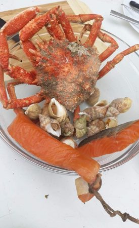 Pendant que je marchais sur l’Allée Verte, Dominique a acheté un festin : une araignée, des bulots pour un déjeuner au jardin du gîte. C’est très amusant et très long de décortiquer l’araignée, on mange tout sauf les branchies trop coriaces. Pour terminer figues violettes et chasselas.