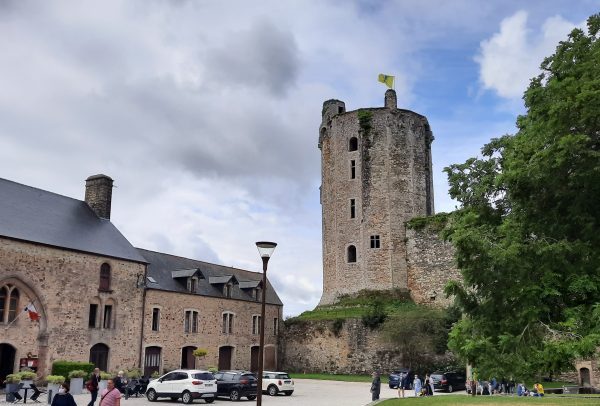 On entre dans la cour du château en passant sous un porche. L’enceinte est complète, elle enferme une vaste cour circulaire autour d’une motte portant le donjon (11ème siècle). Le corps du logis avec la vaste salle d’apparat est maintenant un hôtel.