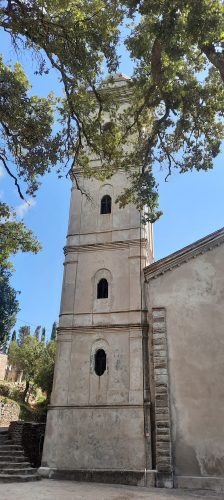 Dernière étape : le village de Tomino à 4km de Macinaggio. A la sortie du village la D353 monte dans un maquis très touffu. Elle serpente complètement à l’ombre de grands arbres. On ne devine le village qu’au dernier moment. La route bifurque, d’un côté la Mairie, de l’autre l’église. De loin se profilent les silhouettes massives de deux tours, l’une ronde, l’autre carrée. Encore la menace d’un chien féroce interrompt la prise de photos.