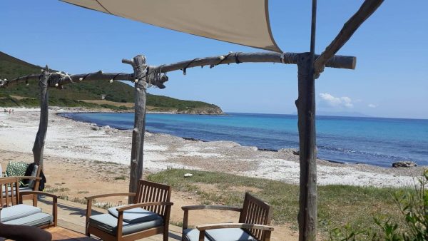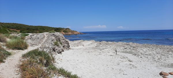 Macinaggio est un village très touristique avec un port de plaisance important, de nombreux restaurants et hôtels. Madame GPS nous envoie dans des petites routes bordées d’hôtels jusqu’à un camping. Le goudron s’interrompt alors ; la piste poussiéreuse fait des montagnes russes avec des nids de poules en prime. La Plage de Tamarone de sable blanc est baignée d’une eau limpide turquoise. En s’approchant on reconnait les tas argentés des lanières de posidonies. Ce ne sont pas des « saletés », au contraire ! les herbiers des posidonies sont les milieux de vie de nombreux poissons, mollusques et crustacés. Il est essentiel de les préserver. Evidemment quand l’eau en contient beaucoup la transparence est altérée mais cela n’a rien d’une pollution quelconque.