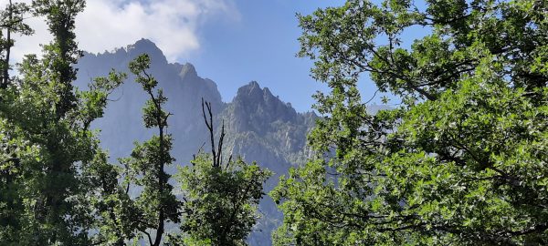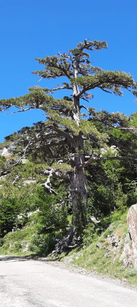 Le Fium’orbo fait une courbe vers le sud. Une petite route très sinueuse monte vers la station de ski de Campannella (3 remontées mécaniques) et où se trouve un refuge du GR20 . C’est toute une aventure que cette route qui s’élève de 800 m à 1600 m en 11 km avec un nombre incalculable de tournants et épingles à cheveux. Heureusement il y a très peu de circulation. Seule une voiture viendra à notre rencontre (à vive allure, sûrement un habitant du village). La route traverse une forêt de pins aux fûts impressionnants. Les châtaigniers sont en assez mauvais état. En altitude les hêtres sont nombreux et magnifiques. A la sortie de la forêt, quand commencent les alpages, des pins spectaculaires dressent leur silhouette sur le ciel bleu violent d’altitude. Plantnet les identifie comme Pins Cembro les guides parlent de pin laricio.