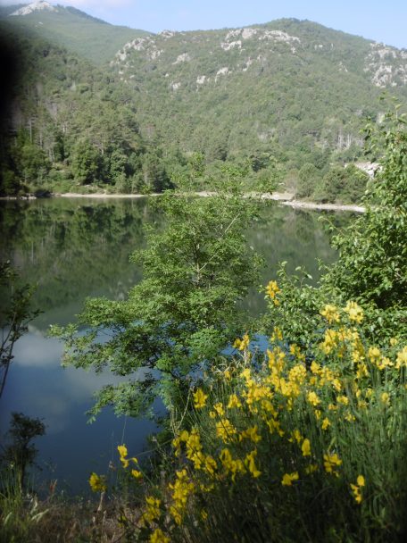 Grande ligne droite de 8 km à travers les vergers d’agrumes et les vignobles. Dans la colline la route passe par un vilain maquis de buissons rabougris et desséchés jusqu’au barrage électrique de Sampolo . un joli lac reflète les sommets et le hameau de Sampolo. La vallée se resserre après le petit pont, les défilés de l’Inzecca et de Strette sont impressionnants. Le fleuve a creusé un canyon étroit. Piscines et cascades se succèdent en contrebas de la D344 très pittoresque mais très étroites. Par endroit deux véhicules ne peuvent pas se croiser et la circulation dans le tunnel est alternée. Des refuges permettent d’attendre que le véhicule d’en face soit passé. Chaque fois que l’arrêt est possible en sécurité je descends prendre des photos. Au fond, le massif du Monte Renoso (2352 m) porte encore des plaques de neige. Un grand pin fourchu mort ressemble à un grand diapason se détachant sur les crêtes.