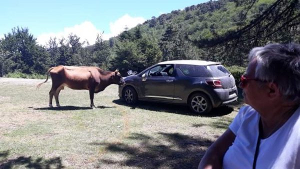 D69 à travers la forêt de Marmano jusqu’au col de Verde où nous déjeunons en compagnie de génisses, veaux et même un taurillon. Les génisses sont curieuses et s’approche de la voiture ; un petit veau dort à quelques pas de nous, il est secoué dans son sommeil. A quoi rêve-t-il ? Où sont les vaches ? Ces bovins divaguent librement. Au col un sentier devait me conduire vers le « plus gros sapin de Corse » encore un arbre remarquable. La serveuse du restaurant-refuge me décourage « c’est loin ! » je demande » 45 minutes c’est aller/retour ? « Non ! deux fois 45 minutes « et encore l’itinéraire n’est pas indiqué.