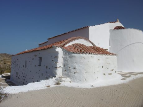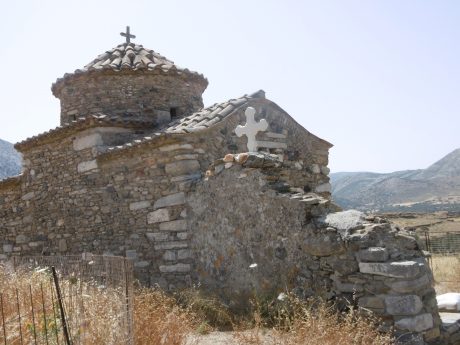 Au col, on voit la mer. La route a fait tant de virages que je ne sais plus quelle côte s’offre à nous : Mikri Vigla et Kastraki ou Kalados au sud. D’après l’urbanisation, je pense plutôt à la côte occidentale. Et ces îles : Paros, les Petites Cyclades ou Amorgos ? Il nous aurait fallu une boussole. Je suis surprise de voir partout des panneaux indiquant les noms de localités ou de ruisseaux. Cette région de Naxos n’set pas du tout déserte comme l’absence de village le suggérerait. Partout, dispersées dans la montagne, des fermes, des bergeries et le long de la route, des églises.